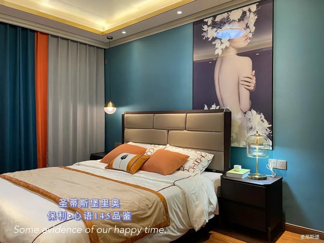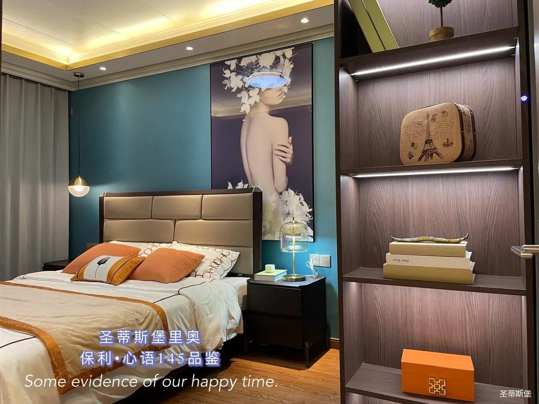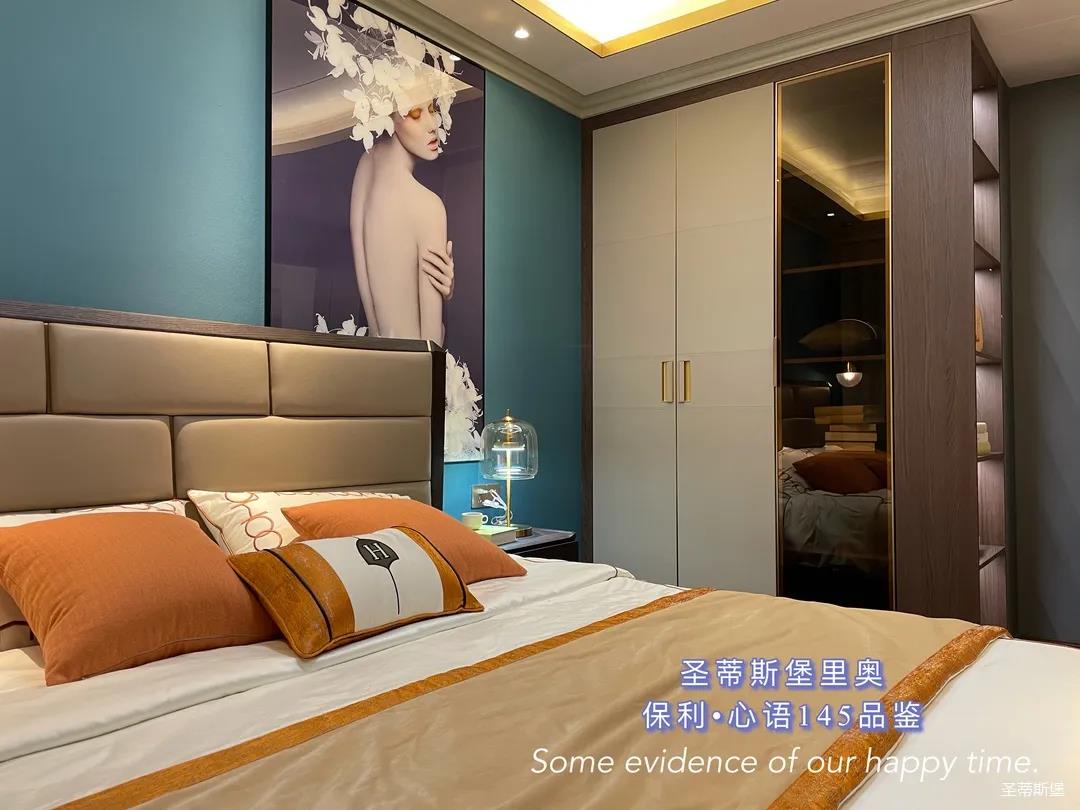 ▲床屏简约的线条与定制柜的功能设置让贴墙的艺术挂画,散发出优雅而大胆的美感。